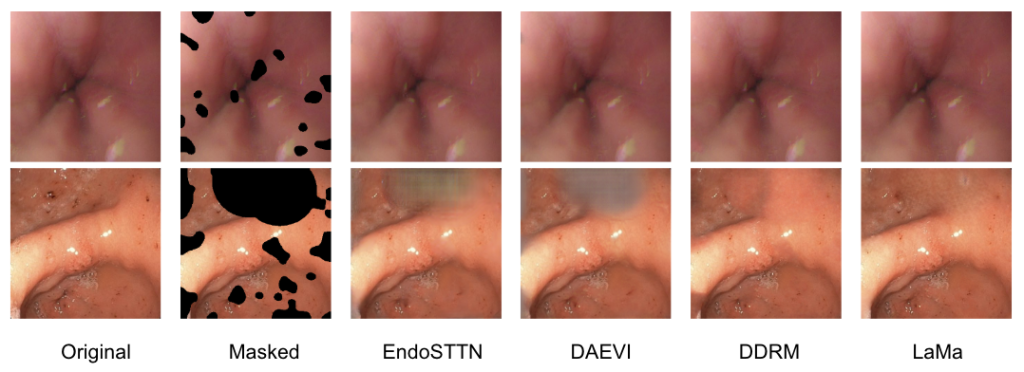 From the results above, we select LaMa as our final model in our endoscopic image restoration pipeline. We can see that the temporal GAN methods are unable to recover large artifact areas and produce non-meaningful results. Diffusion methods aren’t able to accurately recover realistic structure, as DDRM simply splats a flat, uniform blob on the masked regions. However, we can see that LaMa performs well at recovering large masks and geometric structure.