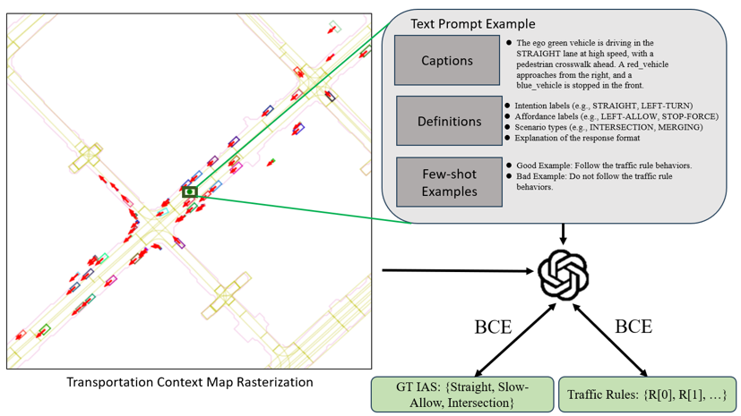 - Affordances (A): Represent the legality or feasibility of possible actions (e.g., can turn left, must stop, must yield to oncoming traffic) as a binary vector in, reflecting actionable constraints imposed by traffic rules and scene context.